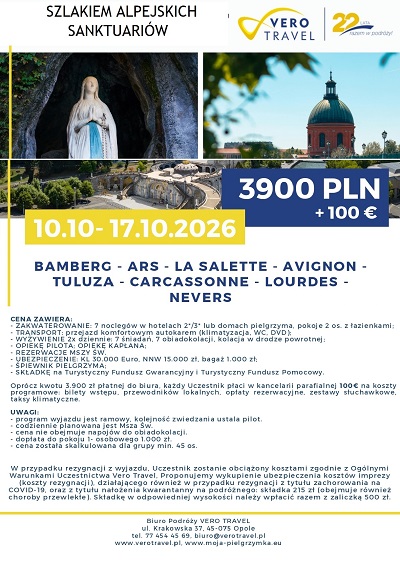 Odwiedzimy: Bamberg, Ars, La Salette, Avignon, Tuluzę, Carcasone, Lourdes oraz Nevers. Termin: 10 – 17 października 2026r. Koszt 3850 zł i 100 Eu.